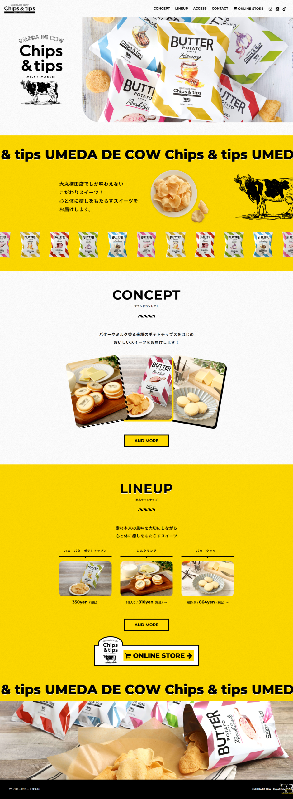 - バターやミルク香る米粉のポテトチップスをはじめ、おいしいスイーツを展開するUMEDA DE CAW Chips&tipsさまのHPを制作。動きもある、ポップなデザインが目を惹くサイトです。